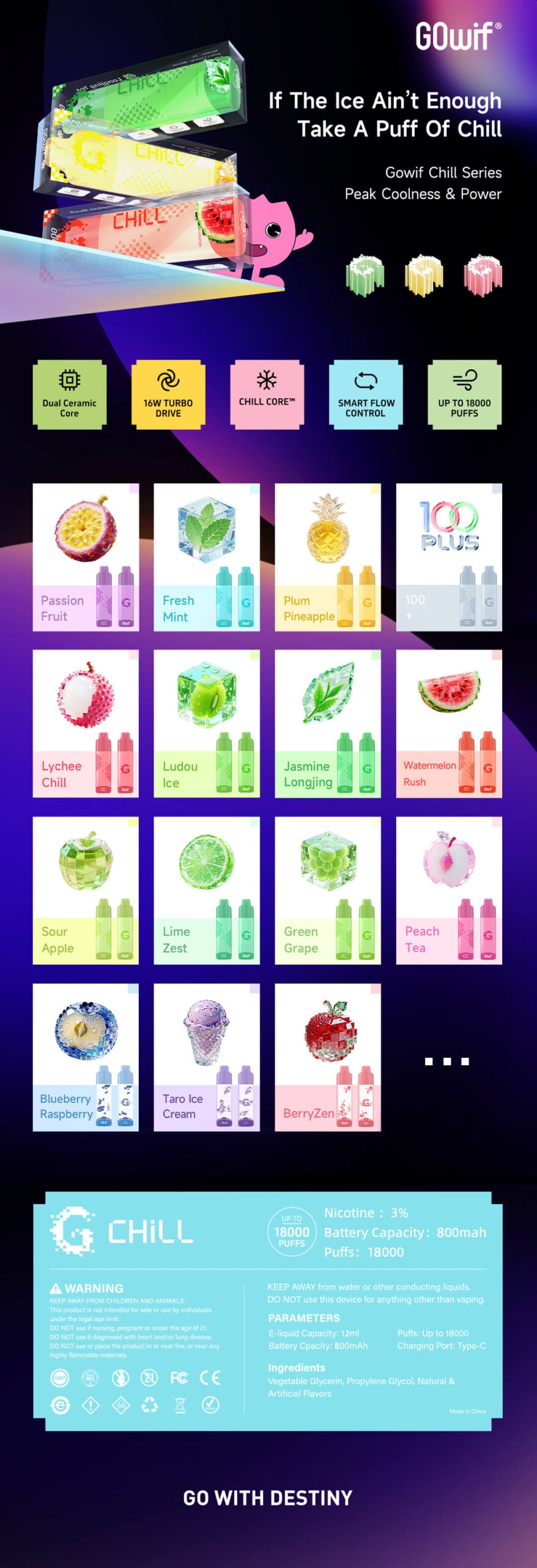 The GOWIF CHILL disposable vape is engineered for instant Arctic refreshment.From its dual ceramic core to the CHILL CORE™ cooling control system. Ice flavor vape with real performance — built for those who want more than just cold.